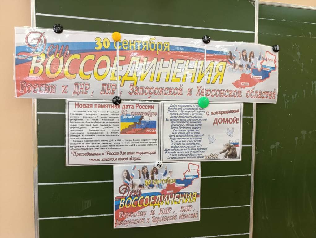 30 сентября 2022 года в состав России вернулись четыре южных региона — Донецкая и Луганская народные республики, а также Херсонская и Запорожская области. Установлена новая памятная дата: День воссоединения новых регионов с Россией. В преддверии празднования этого важного для россиян события сотрудник детской библиотеки "Алые паруса" провела для учащихся среднего звена МОАУ "СОШ №16" тематический обзор "Вновь в единстве с Россией".