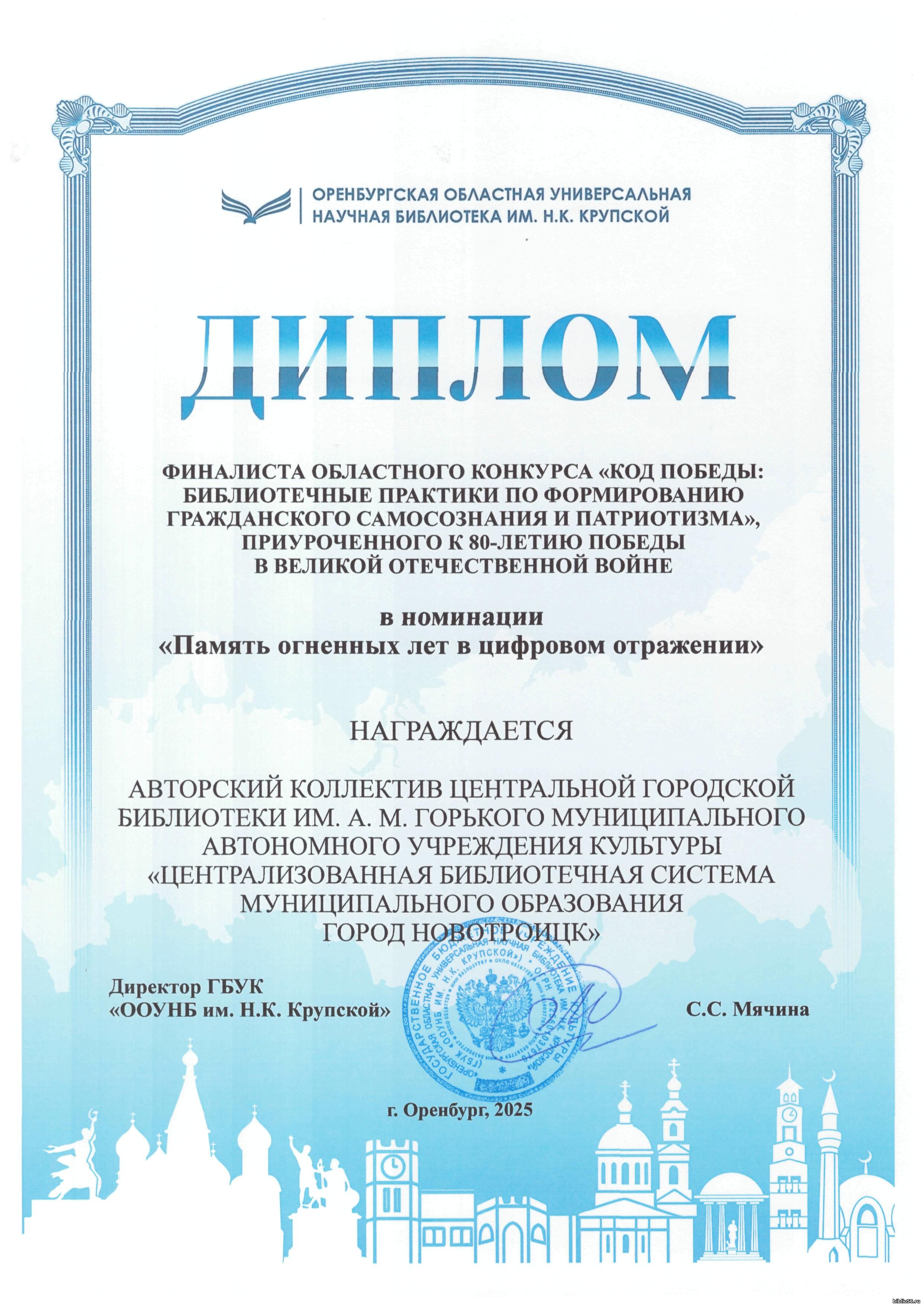 Проект "Помним! Гордимся! Наследуем!", автором которого является библиограф Центральной городской библиотеки им. А.М. Горького Наталья Николаевна Турцова совместно с городским телевидением «НоКС-ТВ», стал финалистом областного конкурса «Код Победы: библиотечные практики по формированию гражданского самосознания и патриотизма» в номинации «Память огненных лет в цифровом отражении».