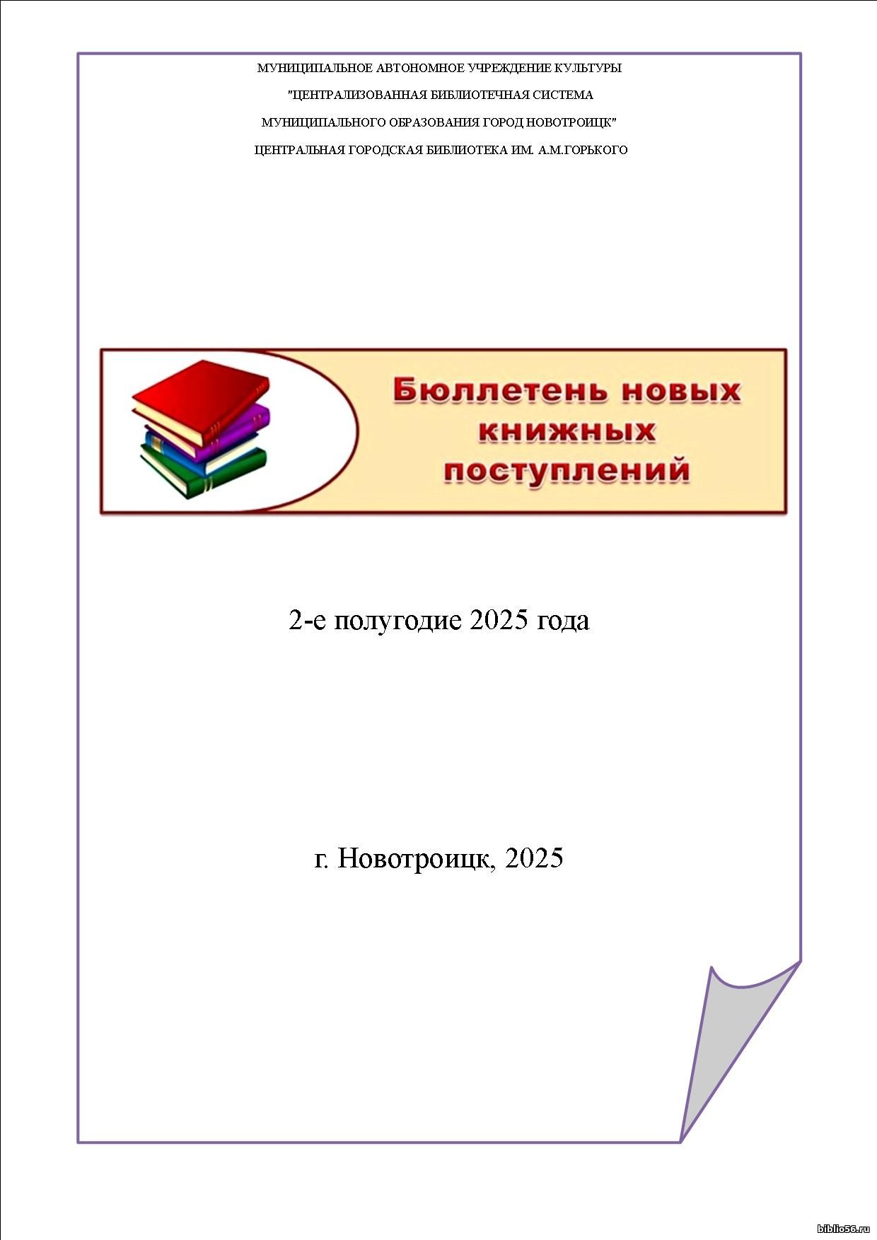 Бюллетень новых книжных поступлений по краеведению 2-е полугодие 2025 : [библиографическое пособие ] : / Муниципальное автономное учреждение культуры «Централизованная библиотечная система Муниципального образования город Новотроицк» Центральная городская библиотека ; сост. Н.Н. Турцова. – Новотроицк, 2025. – 17 c. – Текст : непосредственный.